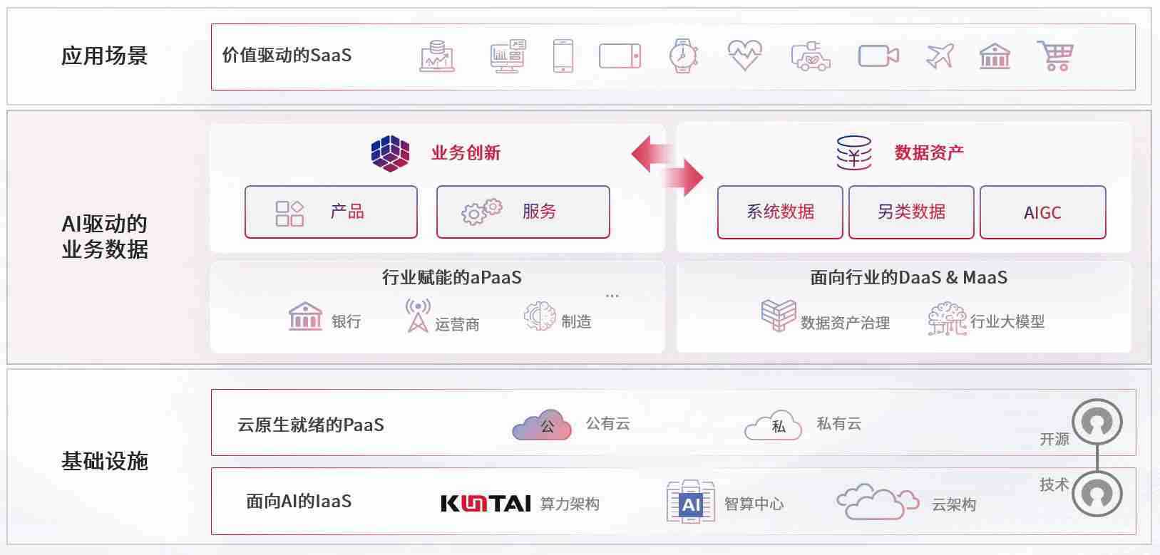 数字时代,,,围绕企业数字化转型的关键要素,,太阳成tyc33455cc数码开创性的提出数云融合战略和技术体系框架,,着力在云原生、、、数字原生、、、AI原生和信创产业上架构产品和服务能力,,为处在不同数字化转型阶段的快消零售、、、、汽车、、金融、、医疗、、、、政企、、教育、、、、运营商等行业客户提供泛在的敏捷IT能力和融合的数据驱动能力,,构建跨界融合创新的数字业务场景和新业务模式,,助力企业级客户建立面向未来的核心能力和竞争优势,,全面推动社会的数字化、、、、智能化转型升级。。